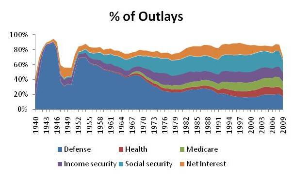 While the defense budget stood at a whopping $690 billion in 2009, its share of the budget is much lower than its historical average of nearly 37% since 1940. In contrast, social security’s share is higher than its historical average of almost 15% and it is rising. The charts below show the trend of these six major budgetary items as a percentage of federal outlays and GDP.