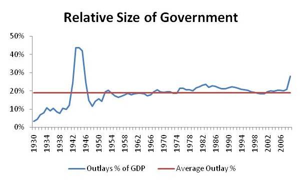 Don’t believe me? Below is a chart showing the percentage of government outlays as a percentage of GDP – a proxy for the relative size of the government to the size of the U.S. economy. Since 1930, the relative size of government was largest during World War II with the top three years being 1943, 1944, and 1945. Guess which year was the fourth largest? You guessed it: 2009.