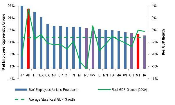 Percentage of Employees Represented by Unions vs. 2009 State Real GDP Growth