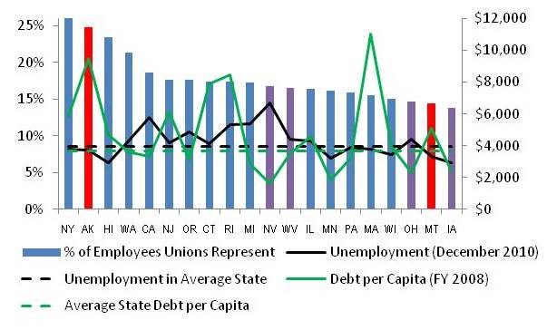 Union Representation vs. State Unemployment and Debt per Capita