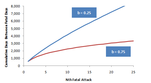 Here is a brief example of how the equation works. As the graph below shows, a higher b results in a much more rapid decrease in days between subsequent fatal attacks as an insurgent force conducts more attacks over time. In essence, the insurgents with b = 0.75 are learning more rapidly than the insurgents with b = 0.25. Therefore, the key for any future counterinsurgency campaign is to make every effort to maintain a very low or negative b.