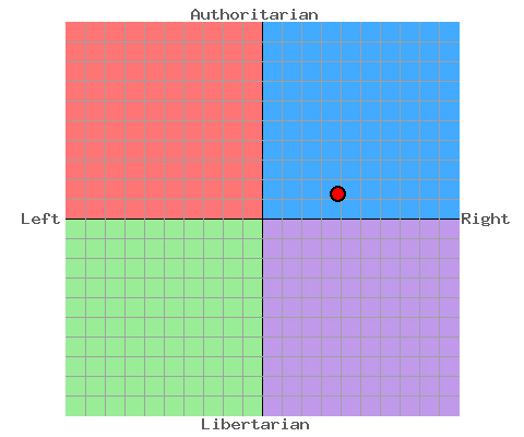 I scored a 3.88 on the economic left/right axis and a 1.23 on the social libertarian/authoritarian axis. In essence, I favor free market economic policies (within reason) and am slightly more conservative when it comes to social policies (again, within reason).