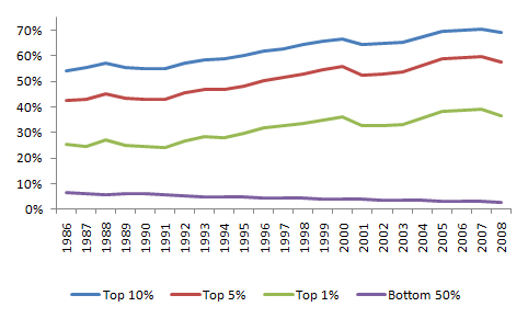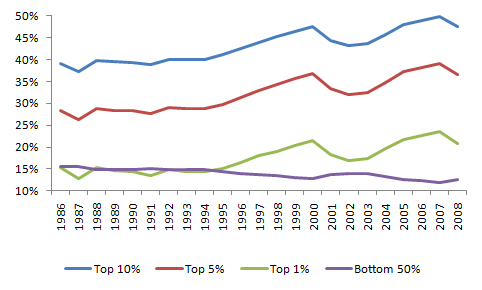 The common rebuttal to the fact that the top 10% pays nearly 70% of income taxes is that the rich have become much richer in recent decades, while the poor have gotten poorer. The data seem to indicate this contention is indeed true. For instance, the top 10% of income earners accounted for 39.1% of the nation’s total reported income in 1986, but 47.6% of it in 2008. The bottom 50% accounted for 15.5% in 1986, but 12.5% in 2008.