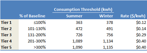PG&E supplies electricity to my area via the following seasonal, five-tier rating structure for an average 30-day month.