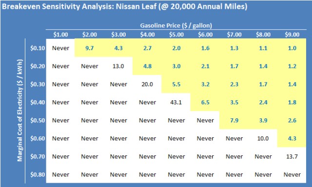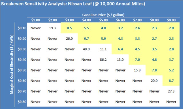 A critical assumption underlying this analysis was that my marginal cost of electricity was $0.40 per kWh. Under these conditions, purchasing a Nissan Leaf only made sense at extreme and persistently high gas prices. Both the Tesla Roadster and the Chevy Volt (assuming no behavioral switch from gas to electricity at high gas prices) did not make sense at any realistic fuel price.
