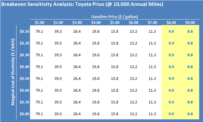 Of course, the price of electricity has no bearing on the decision to purchase a Prius. The chart below shows the time to breakeven for a Prius under different gas and electricity prices. It also assumes that one drives the Prius for an average of 10,000 miles annually. Note that the range of payback periods are the same regardless of electricity price.