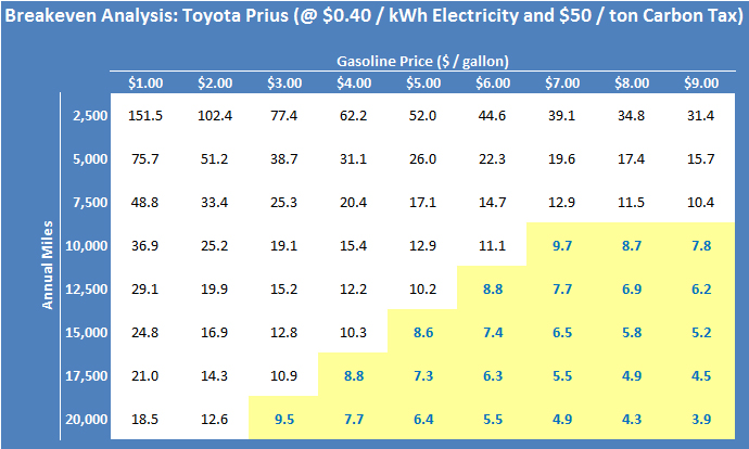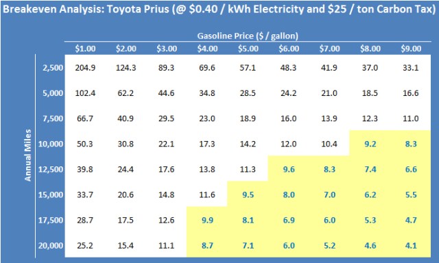 With no carbon tax, the Toyota Prius’ premium has the following payback periods over the price of a Toyota Corolla.