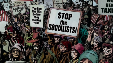 In January 2010, left-leaning writer Ed Brubaker had Marvel’s Captain America and African-American superhero, the Falcon, stumble across a Tea Party protest gathering in Boise, Idaho. There, protestors held signs that read, “Tea Bag the Libs Before They Tea Bag You!” and “Stop the Socialists.” The Falcon remarked that he would not fit in with “a bunch of angry white folks.”