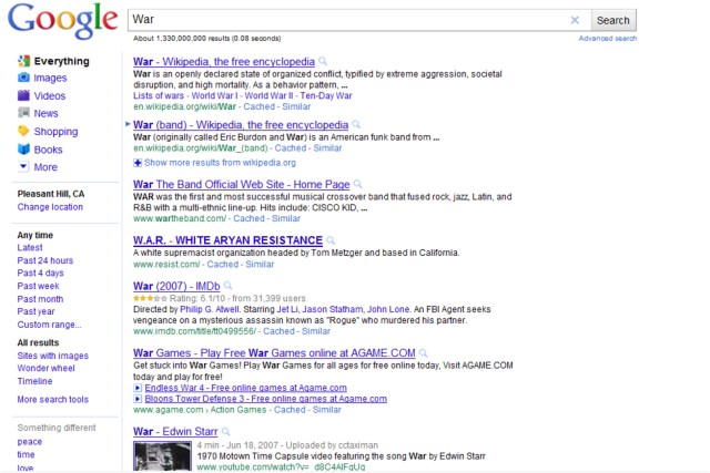 However, upon closer inspection, the ordering of our top three results differs. My first result is the standard Wikipedia entry on War. My mother-in-law’s is for the band War.