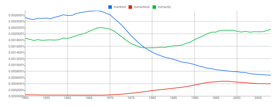 The chart above shows that while the prevalence of “humankind” has increased, it has not overtaken the word “mankind.” However, the word “humanity” has.