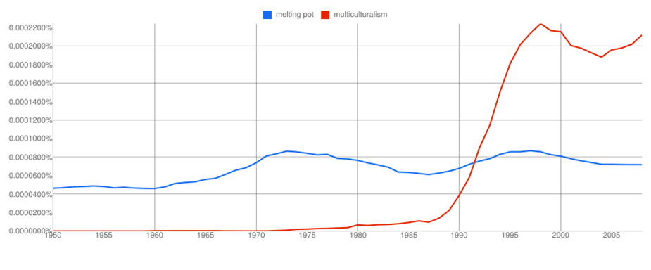 In recent years, the word “multiculturalism” has overshadowed the phrase “melting pot” as the chart below illustrates.
