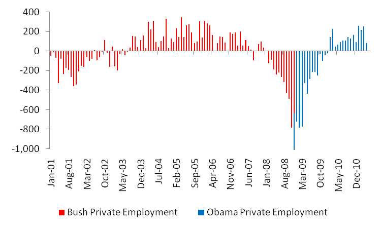 President Bush’s overall record continues to look far better than President Obama’s to date. Over President Bush’s presidency, the private sector created a net 141,000 jobs. Surprisingly, this number includes the 3.78 million private sector jobs lost in 2008.