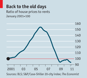 Back in 2005, The Economist published a very insightful analysis that examined the ratio of house prices to rent. The Economist concluded at the time that the ratio was out of whack, and that the housing market was, therefore, in a bubble.