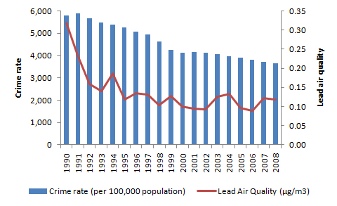 Another interesting theory is that the decline in American children’s exposure to lead as a result of lead’s phase out from gasoline and paint in the 1970s, is linked to lower aggression in adults. In fact, I looked at the correlation between lead concentration in the air and the crime rate. It turns out that the two are  72.1% correlated.