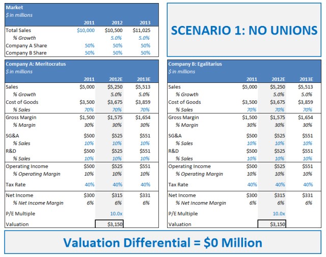 Below is a spreadsheet showing how both companies ended 2011 with identical profits and valuations of $300 million and $3.15 billion, respectively. Both companies operate and pay taxes in the United States. Labor comprises 50% of each company’s cost of goods, and neither company offshores its labor force nor does either have unionized employees…yet.