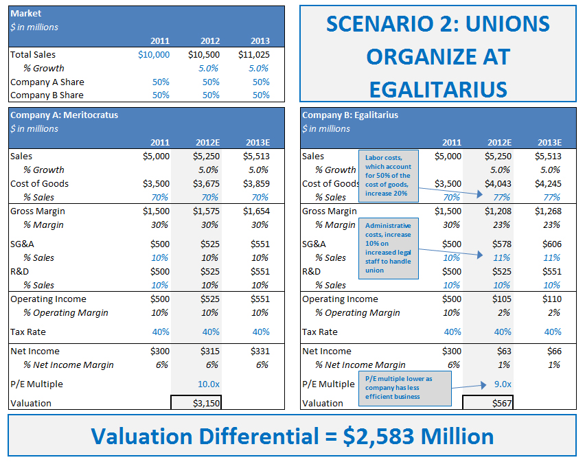 Below is a spreadsheet showing a comparison of both companies after unionization of Egalitarius’ workforce.