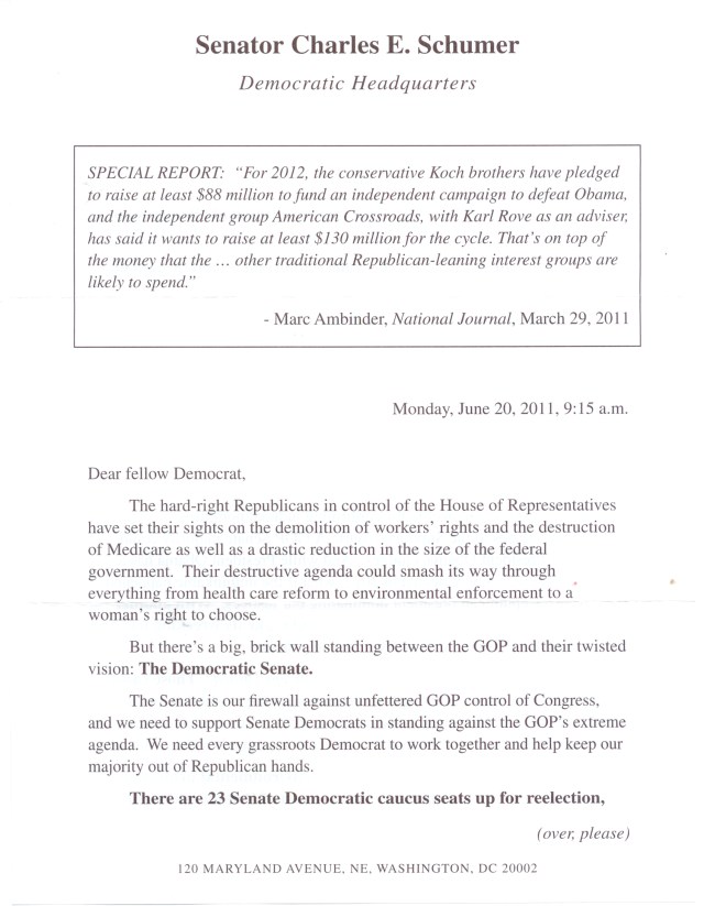 Last week, I received one such letter from Senator Charles Schumer, and it was hilarious.