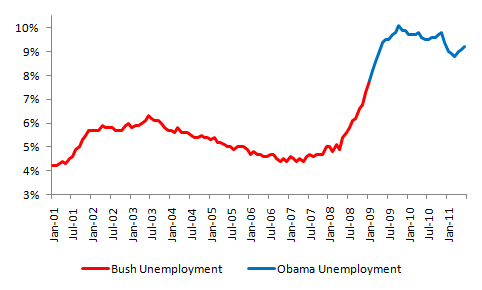 When President Bush started his presidency in January 2001 the unemployment rate was 4.2% which kept climbing the eight years until President Bush left office in January 2009 and left the unemployment rate at 7.8%. When President Obama was in office the unemployment rate continued to rise to 10% in October 2009 until the Democrats got the stimulus package signed into law and bailed out the American automakers that were bankrupt under President Bush’s time in office. Since October of 2009 the unemployment rate has been steadily going back down to where it is now at 8.3% in July 2012. Give President Obama four more years without obstruction from the GOP and he will make it go back down to the rate that President Clinton left it to President Bush.