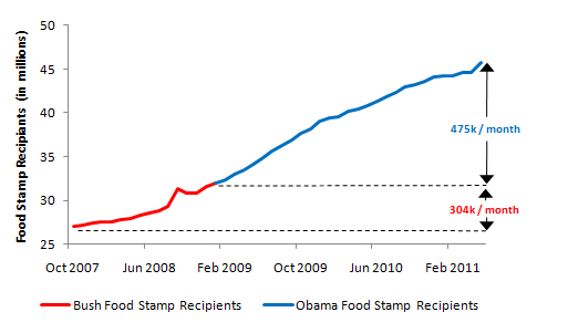Food Stamps are a trailing indicator. Obama was greeted with the worst economic downturn since the Great Depression, as you know. A good number of those added to the roles are a direct result of the economic policies of Bush that drove this country into a ditch.