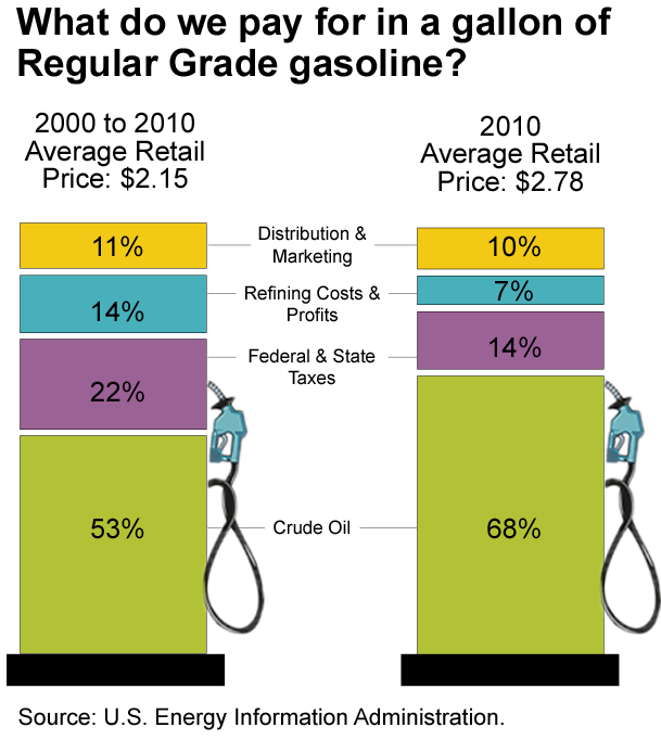 The largest component of cost is crude oil, which represented about 68% of the price of one gallon of regular gasoline in 2010. Finding a way to lower this price would be a major goal of any policy. The second largest component are taxes. Federal excise taxes are currently 18.4 cents per gallon, and state excise taxes averaged 22.06 cents per gallon at the beginning of 2011. The third and fourth largest components are distribution and marketing expenses, and refining costs.
