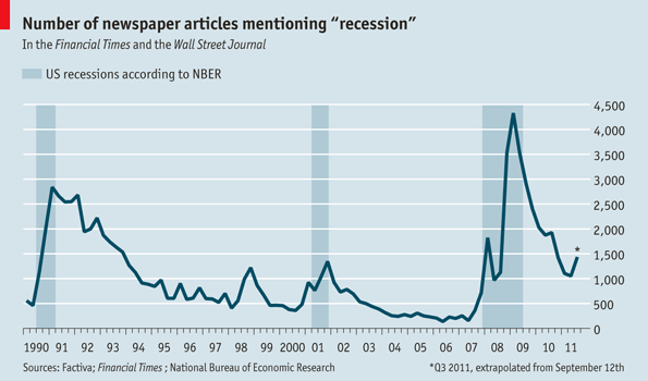 The Economist‘s Daily Chart blog publishes a lot of creative and fascinating charts each week. A little over a week ago, the blog published the chart above, which tracks the number of articles in the Financial Times and the Wall Street Journal that mention the word “recession.” Since 1990, as mentions of the r-word rise, so does the probability that the nation is in a recession.