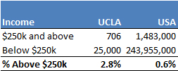 It just so happens that the percentage of UCLA’s approximately 25,000 employees making over $250,000 in 2010 was about 2.8%. For the United States at large, it was only 0.6% (Note: this should not be confused with the number of U.S. households making over $250k, which is a higher than 0.6%).