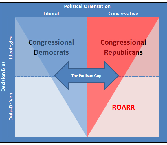The only way to reconcile political differences is to find common ground. The easiest way to do that is to use data to drive decision-making. I believe that people generally fall into four buckets. They are either liberal or conservative, and they favor either ideology or data in policy developement. I believe every sound government should have some ideologically driven leaders from both political parties to inspire us. That said, I believe the government that governs best is one populated predominantly by data-driven decision-makers. For these individuals, ideology is important, but data is supreme. The problem today is that America’s government is dominated by data-fudging ideologues who care more for party than for problem-solving.