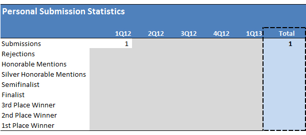 Update: In 3Q10, the contest released two separate lists of Honorable Mentions, one of which I initially missed, and failed to include in my calculations. In 2Q10, the contest release three Honorable Mention lists, only one of which was on the contest’s revamped blog. Additionally, my story is a 1Q12, not a 4Q11, entry. I adjusted these three items to account for this oversight.