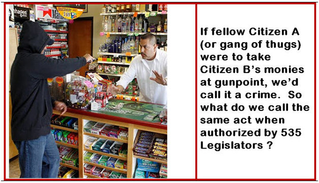 “If citizen A takes were to take citizen B’s monies at gunpoint, we’d call it a crime. So what do we call it when the same act when authorized by 535 Legislators?”