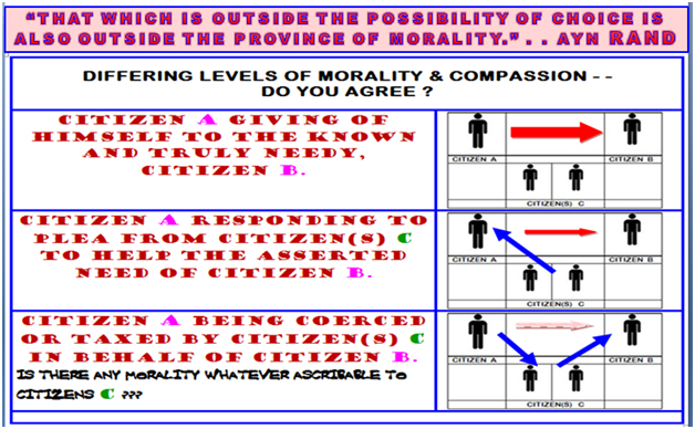 What reality is that? Going “forwards” or “backwards” is simply a matter of orientation. You are choosing to face one direction, I another. This has nothing to do with the effectiveness of helping a fellow human being. I believe that Ayn Rand had it quite right: “That which is outside the possibility of choice, is also outside the province of morality”. When the government forces person A to help Person B – – with no choice involved on the part of A – – there is no morality in the basic concept from the start – – and things go downhill from there.