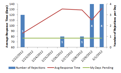 Over the past ten days, authors have reported 13 rejections out of 137 Duotrope-reported 1Q12 (also known as 1Q of Volume 29) Writers of the Future Contest submissions. The historical data implies that the judges have only sent out about 12% of the overall rejections, and that the folks on Duotrope can expect about 98 more by the time the 1Q12 contest is complete. Either way, I look forward to keeping everyone informed about the contest status.