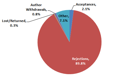 Of the 381 Duotrope-reported submissions to the Writers of the Future Contest over the past year, only 2.1% of these submissions won the contest. Nearly 90% reported rejections, and the remainder either reported their submission lost or returned, withdrew their submission, or failed to report anything at all. My analysis assumes that people do not report their results if they are non-winning finalists, semifinalists, or receive honorable mentions.