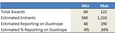 I estimate that between 4 and 34% of the Writers of the Future Contest submissions are included in the Duotrope database. This estimate implies that the number of submissions in 1Q12 ranges from 403 to 3,481. That said, based on the historical data I provided above, it still likely fits into the more narrow range of 560 to 1,210.