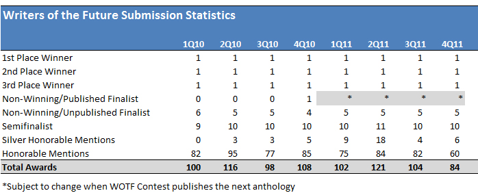 Back in December, I posted an article on the Writers of the Future Contest. Since then, the contest has reported 4Q11 contest winners, and rejections have started trickling in for 1Q12. Unfortunately or fortunately, I have no news to report on my own submission. That said, I have analyzed the data reported thus far to provide some further insight for those interested in the contest.