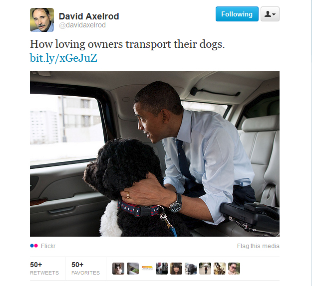 Why has President Obama allowed this animal oppression to rise on his watch? It seems a bit picayune then to criticize Mitt Romney for long ago putting his dog in much more comfortable conditions than those mandated by modern airliners. So why is it an issue, particularly when the president himself has feasted upon dog flesh? In hindsight, Mr. Axelrod’s tweeted picture above seems downright creepy.
