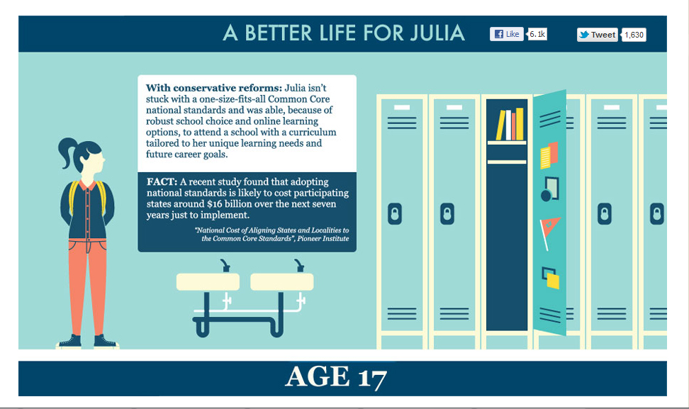 The Obama slide you pull out makes sense. Julia is impacted by a loss of school funding. The heritage slide is much more opaque. National standards are bad because it will cost schools money to implement them, but it doesn’t address any supposed deficiencies in the new curriculum. If new standards are better, then no one should care if they are also a little more expensive. Granted, there’s a cost benefit analysis to make there, but all of that is irrelevant to Julia.