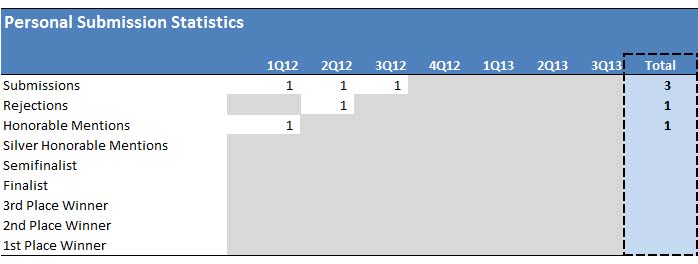 Sadly, I did not place in 2Q29. Upon reviewing my story, it made sense why. It seemed I had needed at least one more revision before the story was ready for prime time. At least there is always hope for future quarters. My 3Q12 submission is currently in the queue awaiting judgement, and my 4Q12 story is complete and ready for submission.