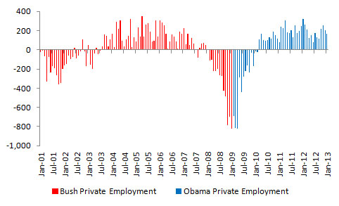 For each job the private sector cut under George W. Bush, the private sector gained~2.9 jobs under Barack Obama (if one attributes January 2009’s job losses to Obama, the private sector added ~11.7 jobs for every job it created under Bush). The economy would need to destroy 2.58 million private sector jobs for Bush to break even with Obama (not accounting for the 125,000 jobs that the economy must create each month just to keep pace with population growth).