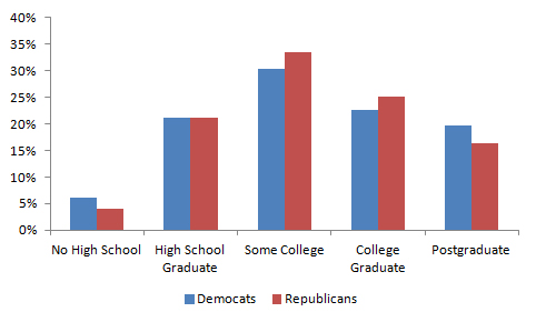 To test my theory, I looked at education levels by voter in the 2000, 2004, 2008, and 2012 presidential elections, as well as the 2006 and 2010 midterm elections. In every case, the share of people with no high school education was higher among people voting for Democratic candidates than it was among people voting for Republican candidates. On the opposite end of the spectrum, in every case, the share of people with a postgraduate education was higher among people voting for Democratic candidates than it was among people voting for Republican candidates.