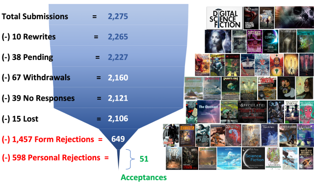 Since December 2011, I’ve written a total of 61 short stories. By the end of 2019, I sold 42 or 69% of them, and 39 have already been published. While a 69% hit rate seems pretty impressive on the surface, I’ve sent out 2,275 submissions to publishers and have accumulated 2,055 rejections to get there.