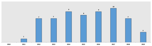 You can’t win if you don’t play, and the more you play, the more you win. For a relatively unknown author, the writing game is one that rewards persistence. There’s also a huge element of luck. Sometimes you have to hit the right editor at the right time with the right story. You can’t do that if you aren’t constantly taking shots on goal. As such, from 2014 to 2016, I’d consistently submitted at least one story a day to various publications. Since my acceptance rate doubled from 2015 to 2016, I sent fewer submissions in 2017 and 2018, primarily so I could spend more time writing than submitting. I continued to follow this strategy in 2019, but I had far fewer submissions, mostly because I had written only 3 new short stories.
