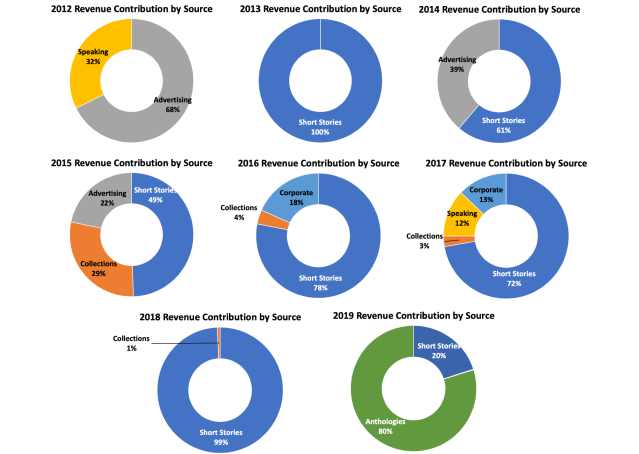 My revenue stream was a bit more diversified in 2019 than it was in 2018 with only 20% of my revenue deriving from short stories vs. 99% in 2017. As always, I’m hoping that a future novel sale will help diversify these revenue sources.