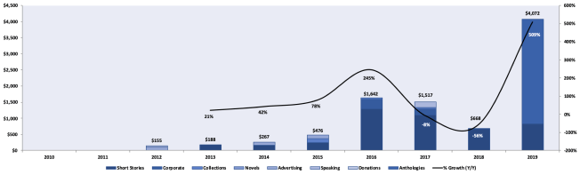 As you can see, I’ve accomplished only 1 of my goals, am still on track to accomplish another one of them, and have failed to hit the remaining 7. Yikes! While I can do better, the very discipline of setting these goals kept me focused throughout the year. As such, I will be setting my goals for 2020 at the end of this post, but before I do that, I’d like to cover my annual writing statistics starting with my 2019 writing revenue.