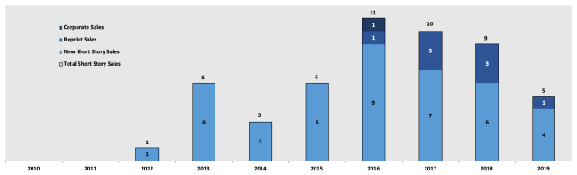 As I noted above, I sold 5 short stories this year, which is down 44% from my 2018 sales. However, to put that number into perspective, prior to 2016, I’d sold a total of 16 stories in my lifetime. From 2016 to 2019, I’d made another 41 sales, including 26 originals, 1 corporate sale, and 8 reprints. More importantly, 1 of those 2019 sales was at a professional rate. While that’s not very impressive, it’s important to note that I only wrote 3 new stories in 2019, 33% of which sold at a professional rate. Also, prior to 2016, I had only 1 professional sale; after 2015, I had 8.